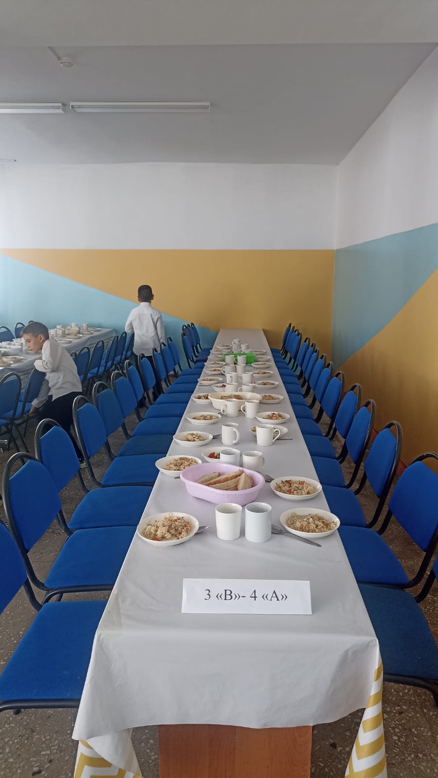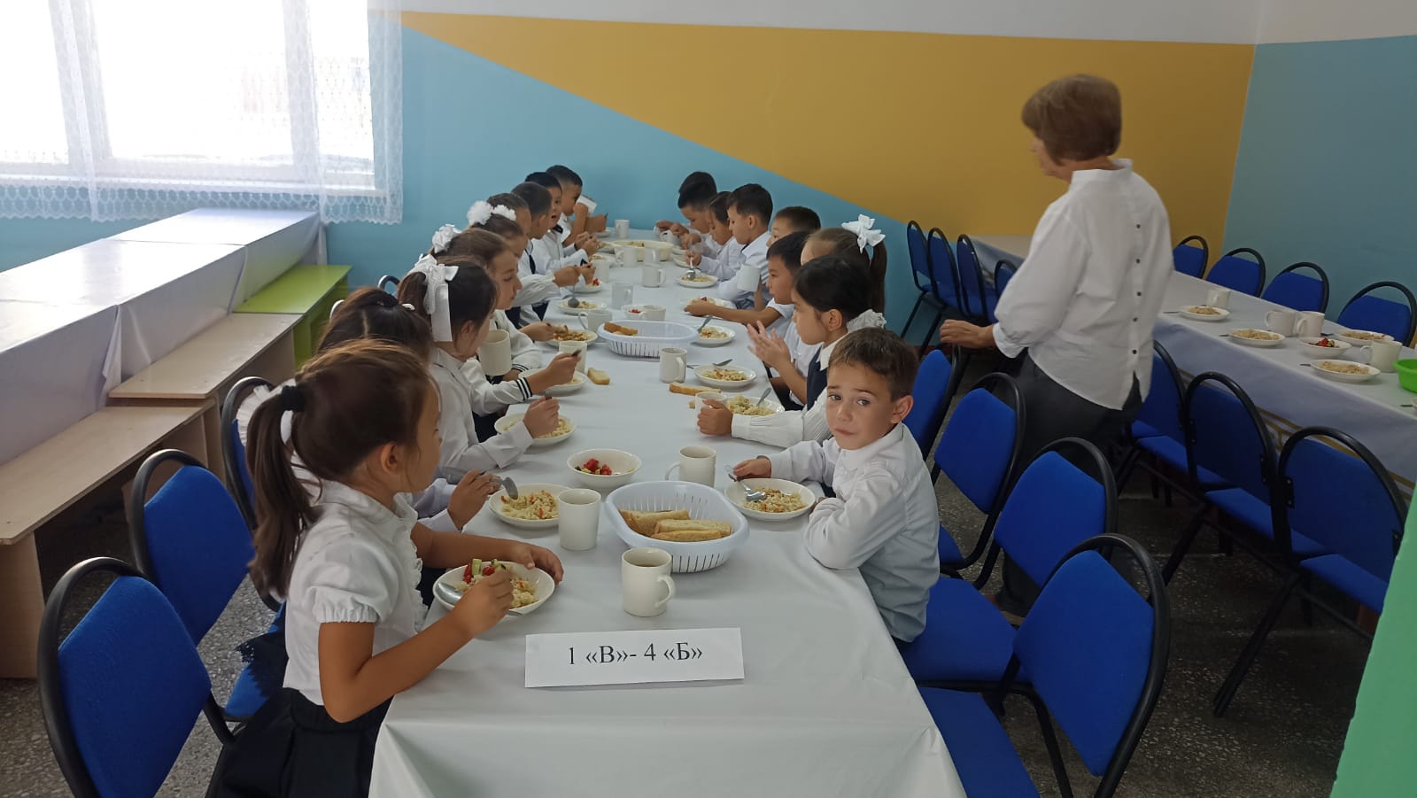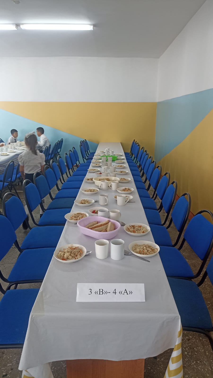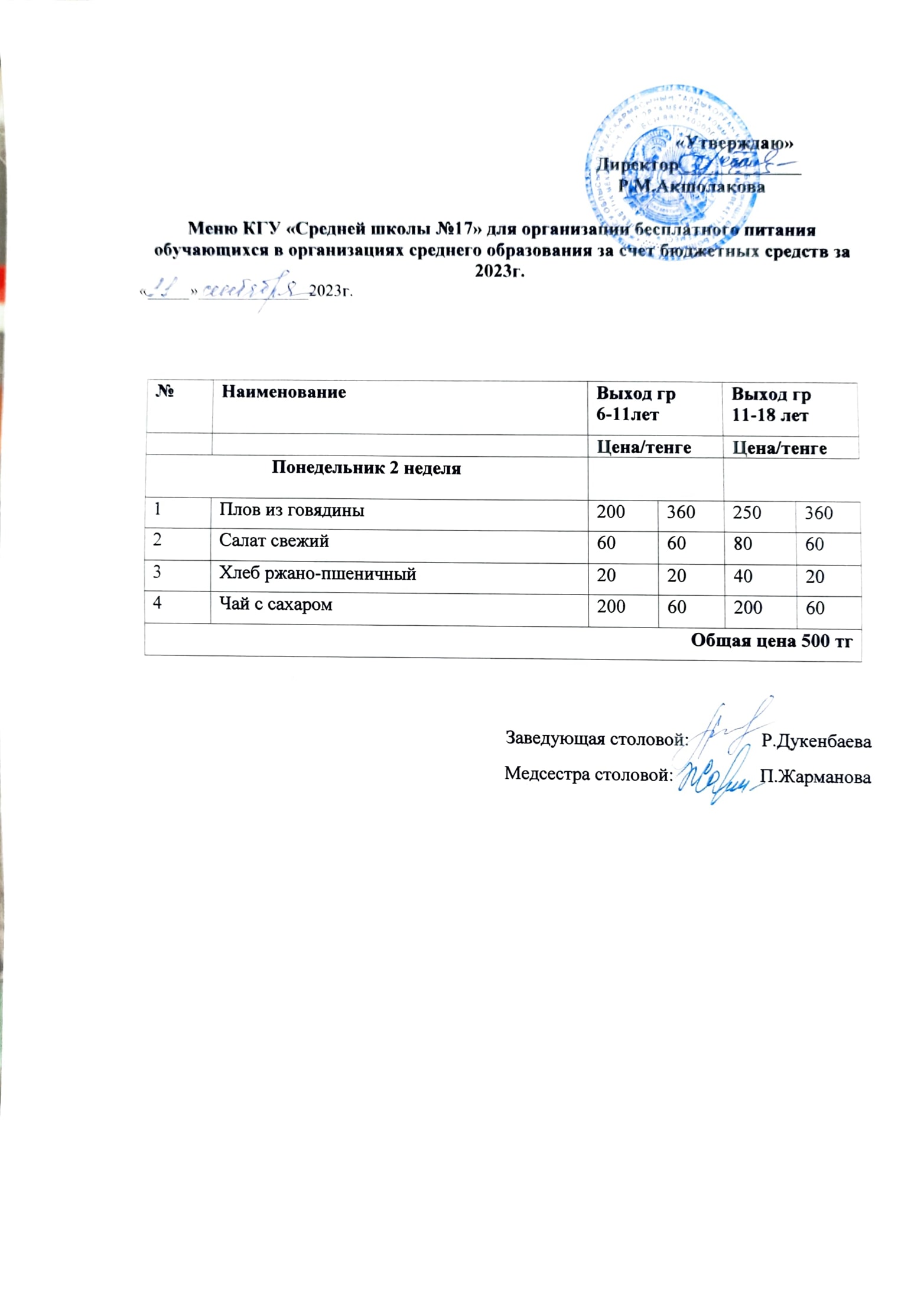 Горячие блюда, подаваемые в нашей школе, готовятся по установленному меню. Повара каждый день пишут и утверждают виды блюд. Медицинский работник школы М. Б. Жарманова следит за качеством и видами питания в столовой и ведет запись в специальном журнале. 11 сентября 2023 года в меню были следующие блюда: