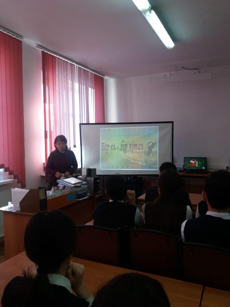 Қаңтар айының 18 жұлдызында мектеп кітапханасында 9 а сынып оқушыларының қатысуымен «Бір ел-бір кітап» акциясы өтті.