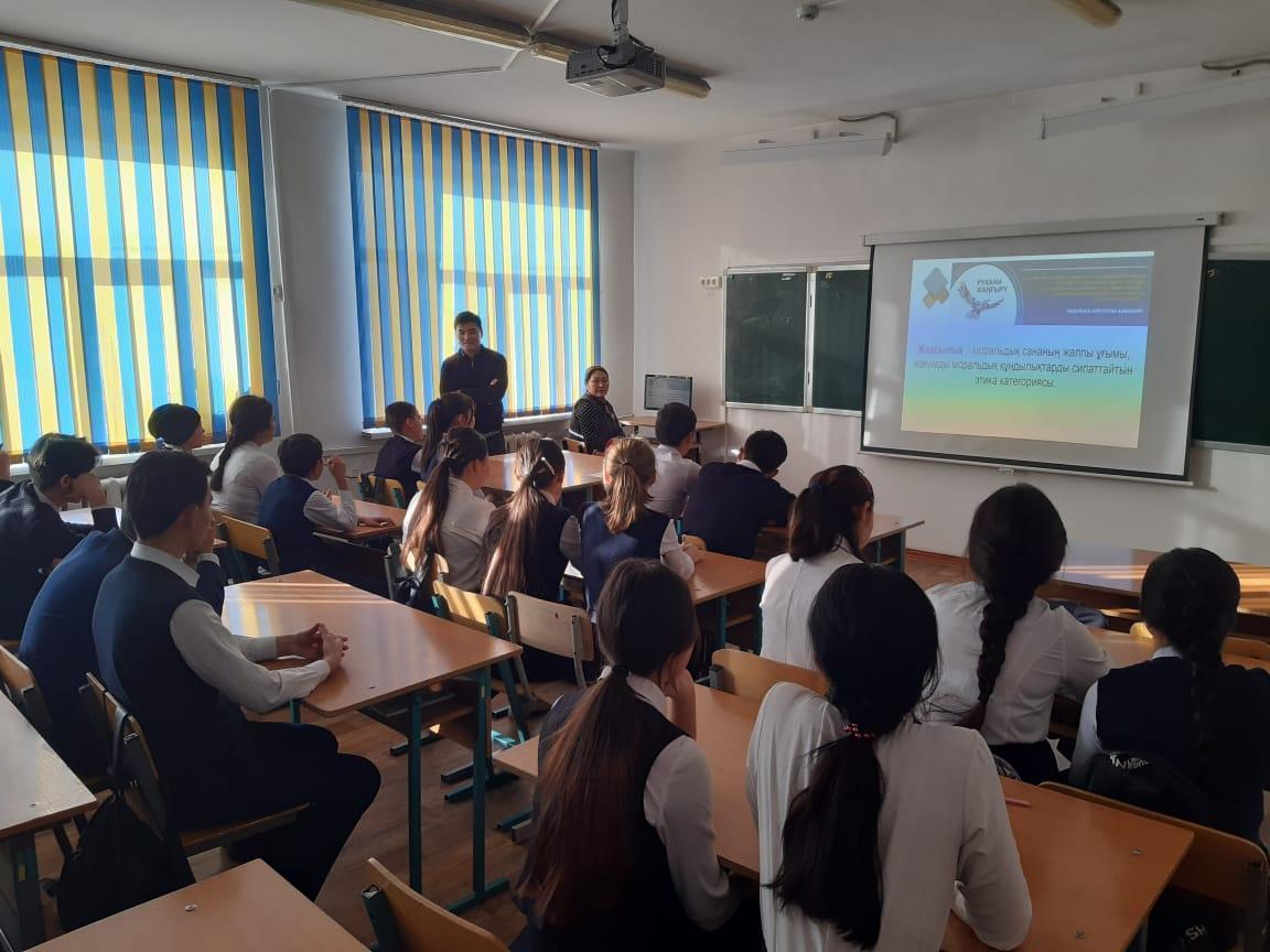 Тақырыпты тұрған үш ұғым туралы мектебімізде 2020 жылдың қаңтар айының 17 күні сағат 10:00 де 8-11 сыныптар арасында сынып сағаттары өтті. Аталмыш сынып сағаттарға мектеп инспекторы А. Еркенбекова, директордың тәрбие ісі жөніндегі орынбасары Туракбаев К, педагог ұйымдастырушы Даулеткелдинова С, Адал ұрпақ еріктілер ұйымы, Жас Полиция көмекшілері қатысты. Ондағы жалпы мақсат қоғамның індетіне айналған жемқорлықпен күрес, өз отанына деген қамқорлық, бүгінгі оқушы ертеңгі Қазақстанымыздың негізгі қозғаушы күші екенін ұғындыру, танымдық, әділде шынайы болуға шақыру болып табылды. Сынып сағаты барысында оқушыларымыз өз ойларымен бөлісіп, пікір алмасып, қазіргі оқушылардың қоғамдағы проблемаларымен тәртіптерін талқыға салды.
