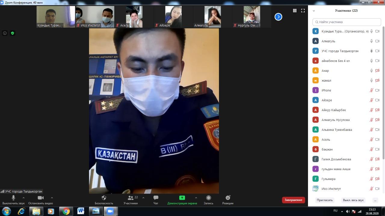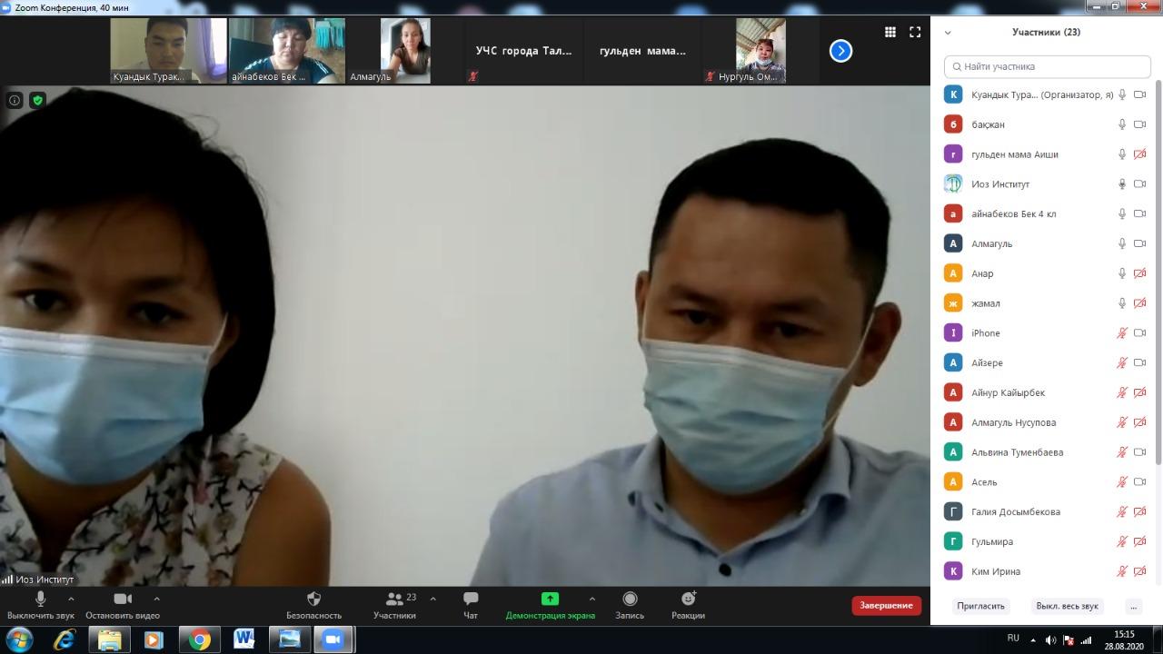 Ағымдағы жылдың 28 тамызында zoom бағдарламасы арқылы жалпы мектепішілік ата-аналар жиналысы өтті. Оған Талдықорған қаласының Төтенше жағдайлар басқармасының инженері, аға лейтенанты Адилханов Ержан Ерболұлы, мектеп инспекторы Мадина Әмірғали, Алматы облысы бойынша салауатты өмир салтын қалыптастыру орталығының маманы Айгерім Жасболатқызы және эпидемиолог дәрігер Сахариев Рандир Даулетұлы, директордың тәрбие ісі жөніндегі орынбасары К.К. Туракбаев қатысты. Аталған жиналыста төмендегі тақырыптар жайында дәріс оқылды.