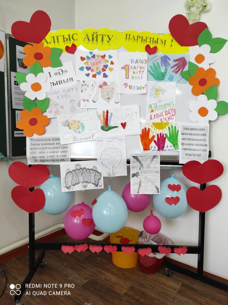 2016 жылғы 14 қаңтарда ҚР Президенті Н.Ә.Назарбаев Қазақстан халқы Ассамблеясының құрылған күні 1 наурызды елімізде Алғыс айту күні деп жариялап, Жарлыққа қол қойған болатын. Осылайша халқымыз жыл сайын дәстүрлі түрде Алғыс айту күнін атап өтеді. Бұл күн — тілі, діні басқа болса да өзгені өзегінен теппей бауырға басқан қонақжай халқымыздың дархан көңілін, бір шаңырақ астында тату-тәтті өмір сүріп отырған сәтті айшықтайтын күн. Мереке қарсаңында мектебімізде түрлі іс-шаралар жүзеге асты ашық сабақ, тәрбие сағаты, сурет салу, эссе жазу, сыныптар арасында челледж ұйымдастырылды. Атқарылған іс-шаралардың басты мақсаты оқушыларға аталмыш мейрамның мән-маңызы жөнінде түсінік беру, ризашылық пен алғыс,сыйластық құндылығы туралы түсініктерін кеңейту, үлкен — кішіге деген сүйіспеншілігін, сыпайылық қарым — қатынасын дамыту, әдептілікке, ізгілікке тәрбиелеу.
