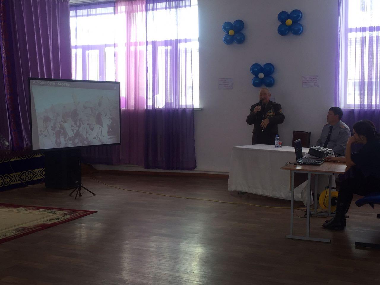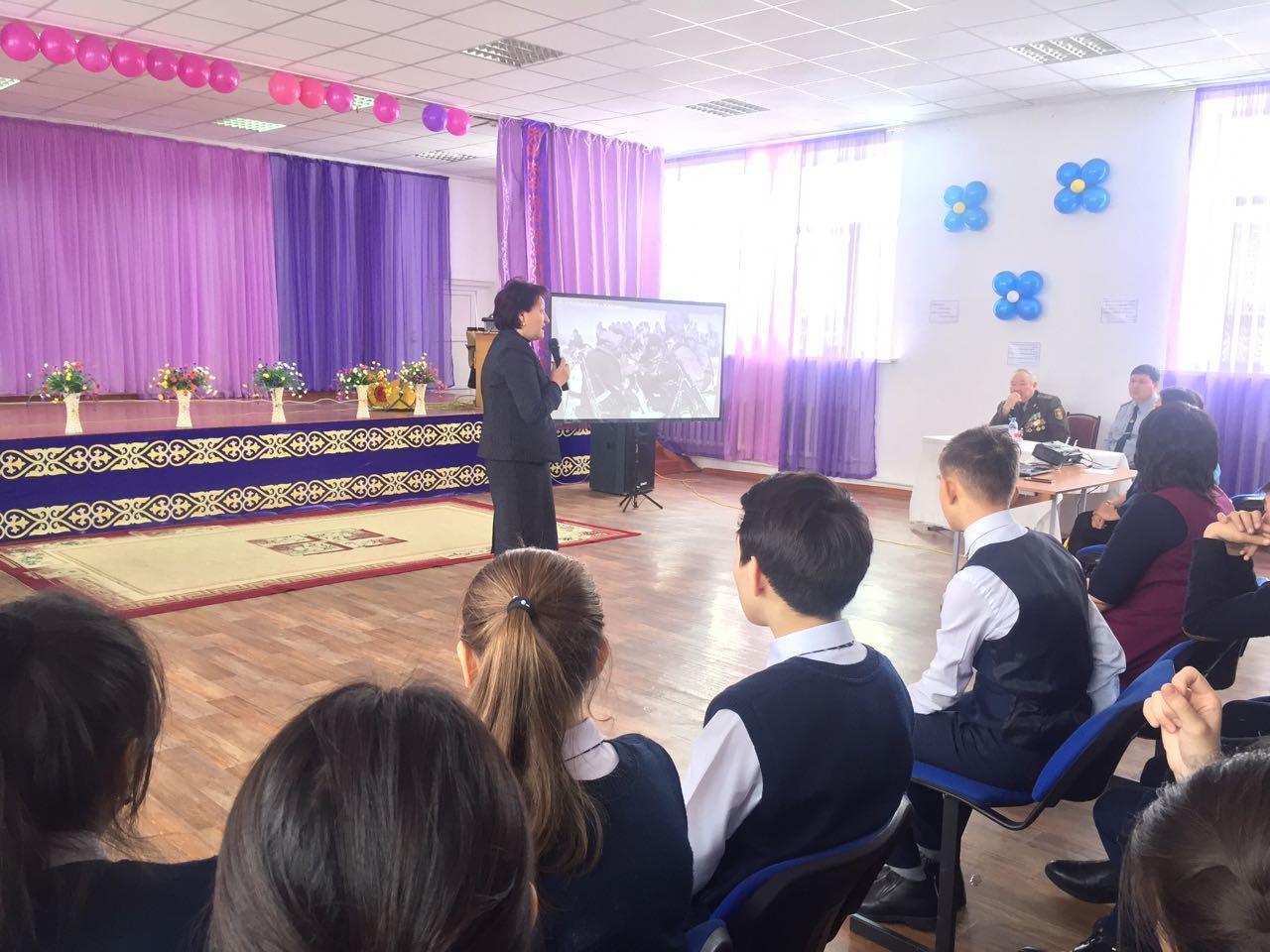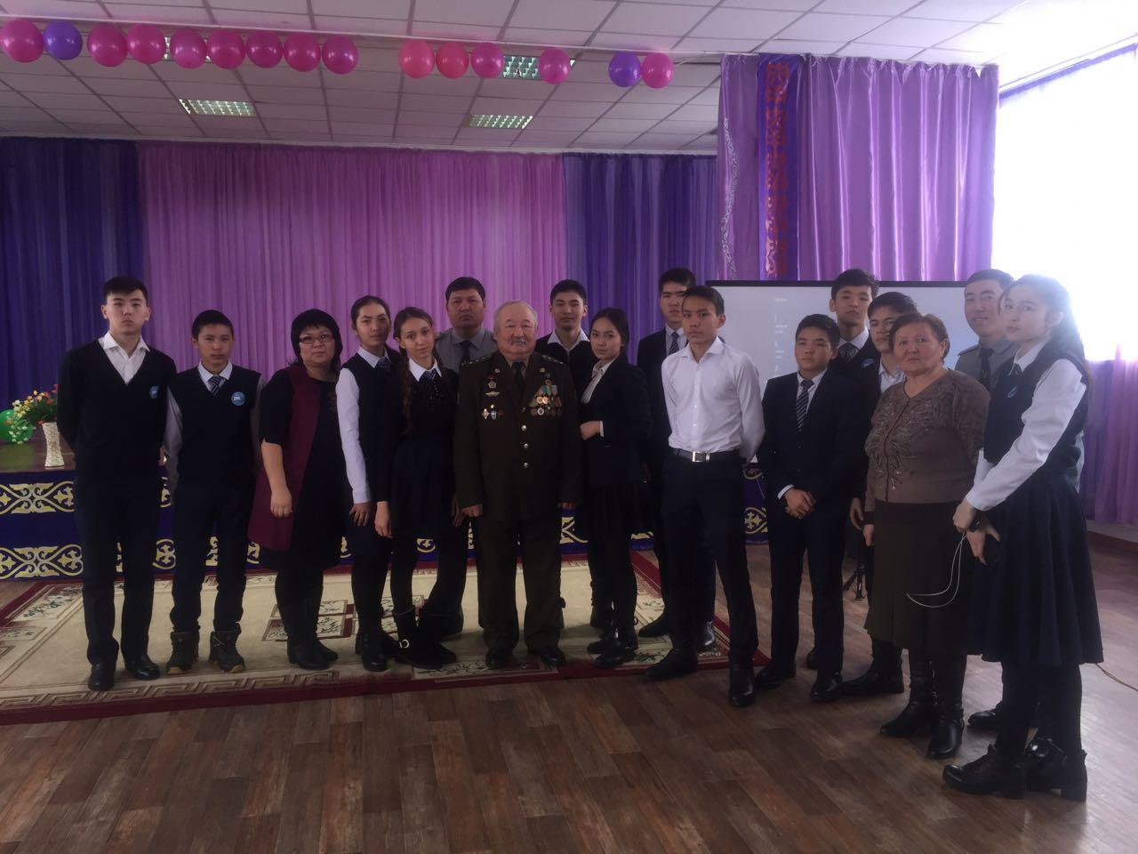 Мақсаты:Ауған оқиғасының тарихи мағынасын ашып, оқушыларға түсіндіру,"Ауған соғысы” жайлы тереңірек білу, соғыс ардагерінен мәлімет алу. Тәуелсіздік  жолында  күрескен  аға-апаларымыздың  ерлігін кейінгі ұрпаққа үлгі ете отырып, оқушыларды ұлтжандылыққа, Отанын сүюге тәрбиелеу. Қатысқан бала саны 23 бала, көрермендер саны 110 оқушы.