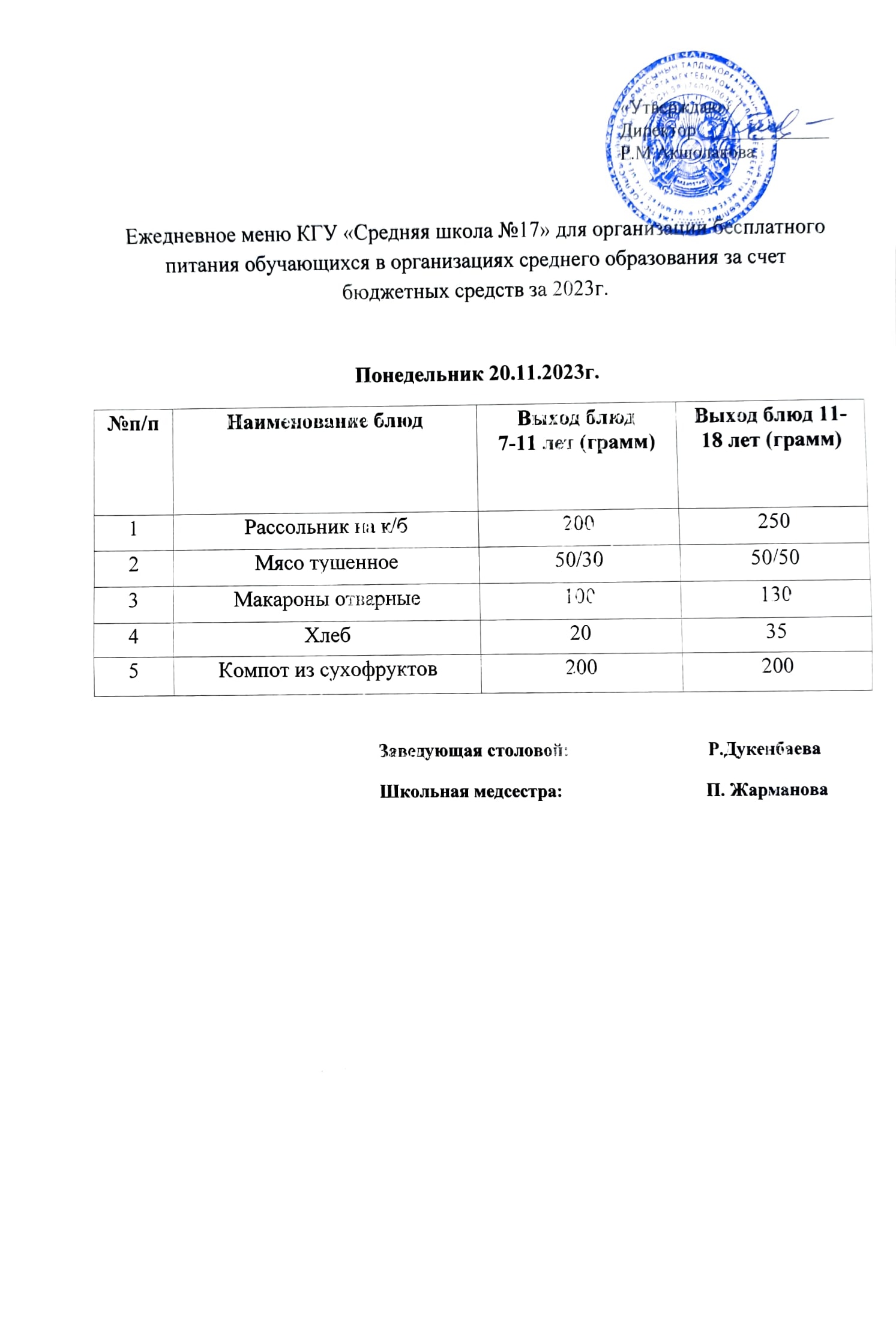 2023 жылдың 20 қарашасында ас мәзірі  бойынша мына тағамдар болды: