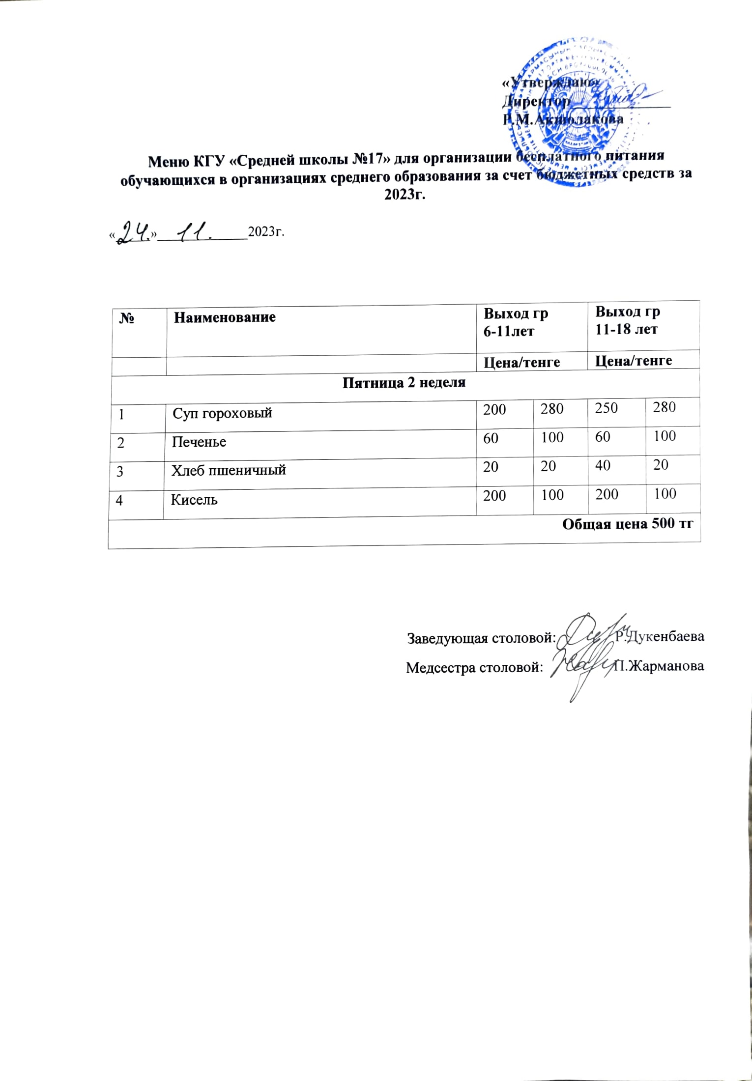 2023 жылдың 24 қарашасында ас мәзірі  бойынша мына тағамдар болды: