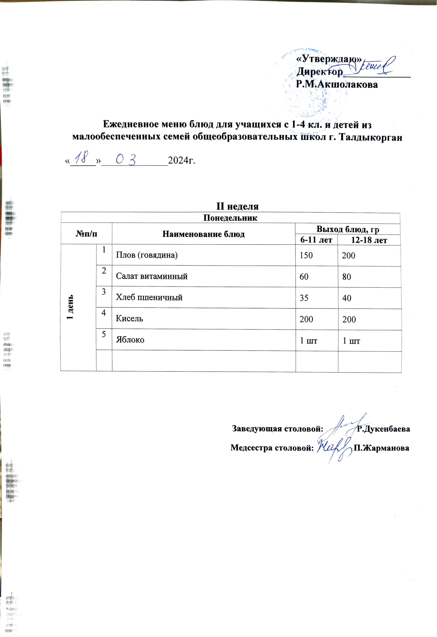 18 март 2024 0 1 2 3 4 5 Ас-адамның арқауы 2024 жылдың 18 наурызында ас мірі бойынша мына тағамдар болды: 1. Плов (говядина) 2.Салат витаминный3. Хлеб пшеничный4.Кисель5.Яблоко