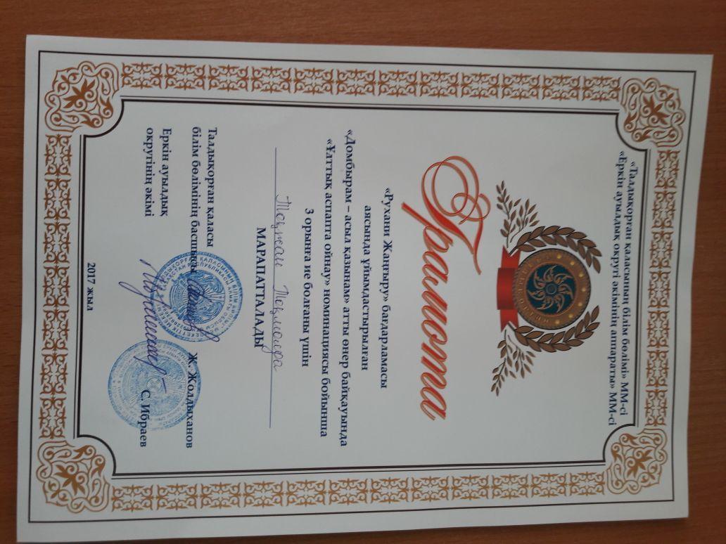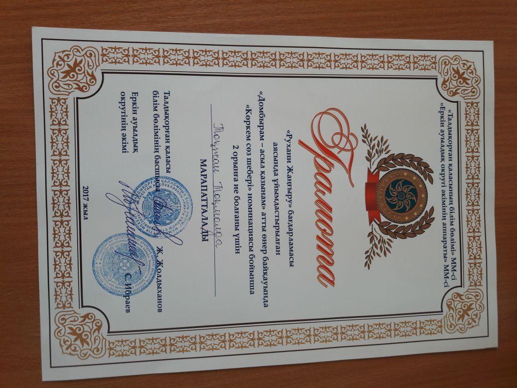"Рухани жаңғыру" бағдарламасы аясында "Еркін ауылдық округі əкімдігінің аппараты" ұйымдастырған "Домбырам - асыл қазынам" атты байқауға N17 орта мектебінің 8а сынып оқушысы Тоқмолда Тоғжан қатысып "Көркем сөз шебері" номинациясы бойынша II-орын, "Ұлттық аспапта ойнау" номинациясы бойынша III- орынды иеленді.