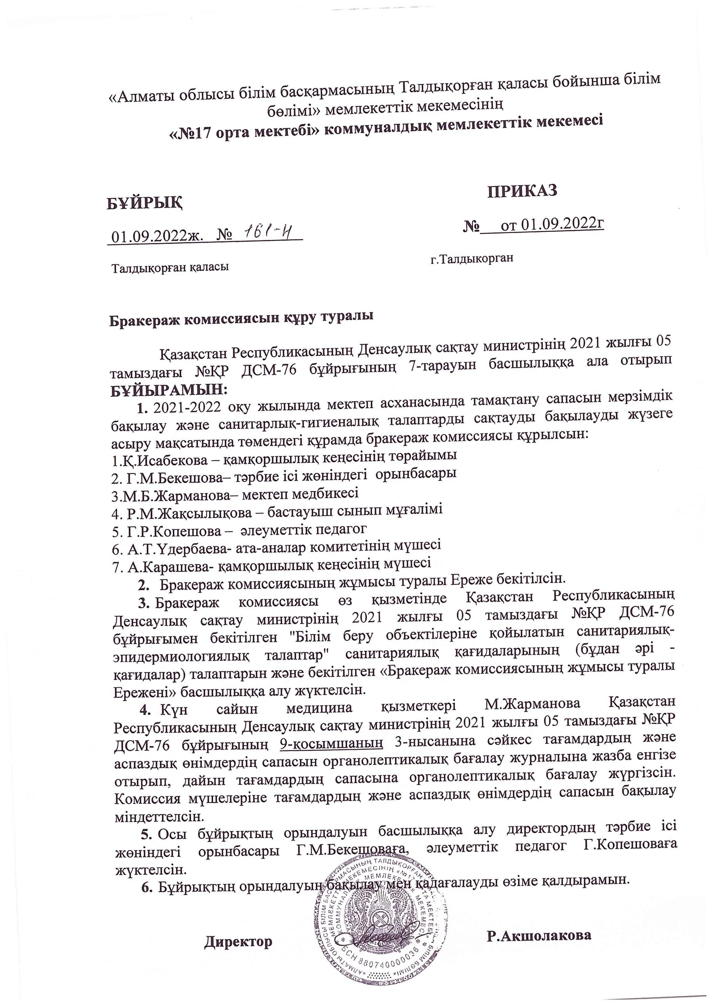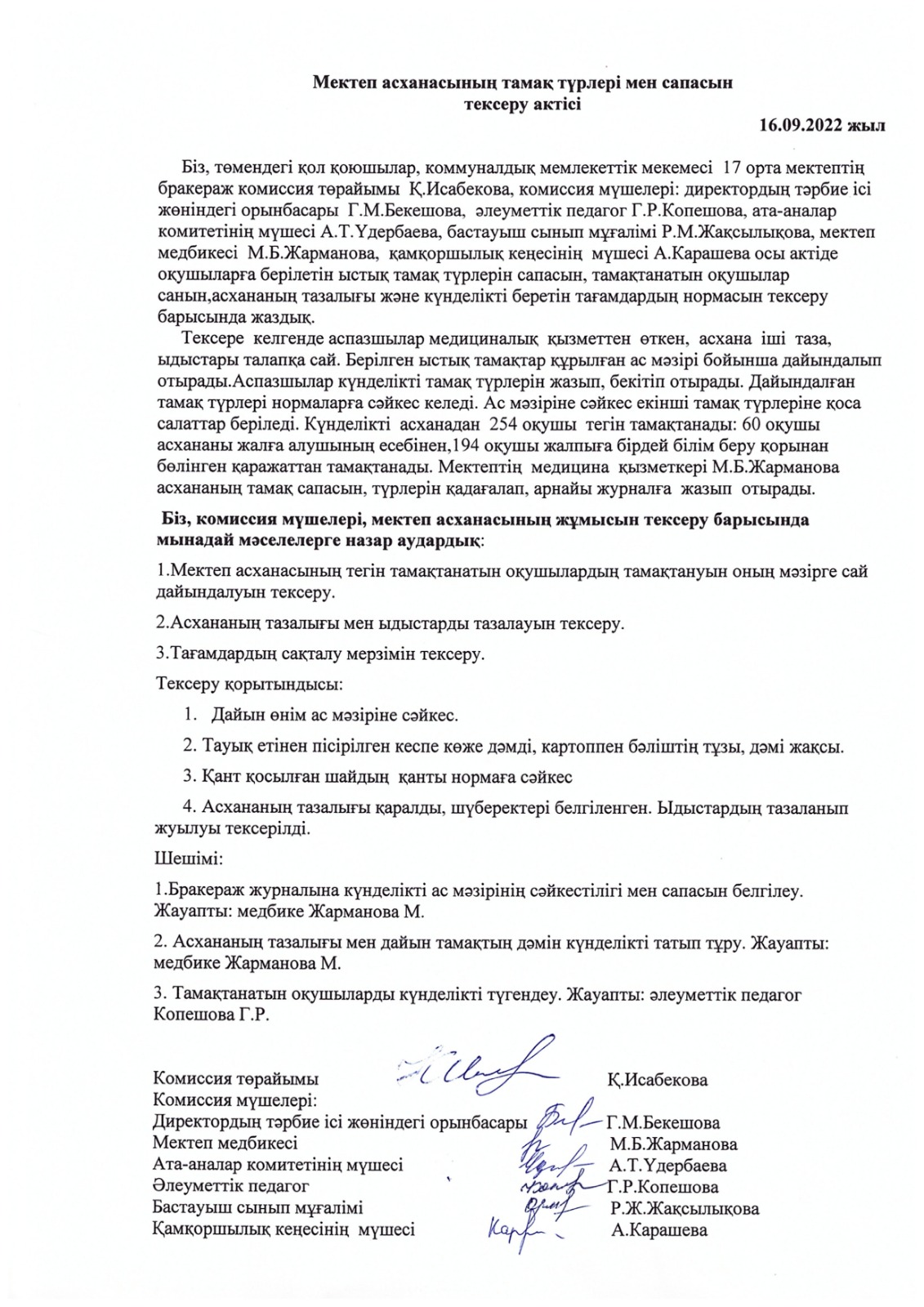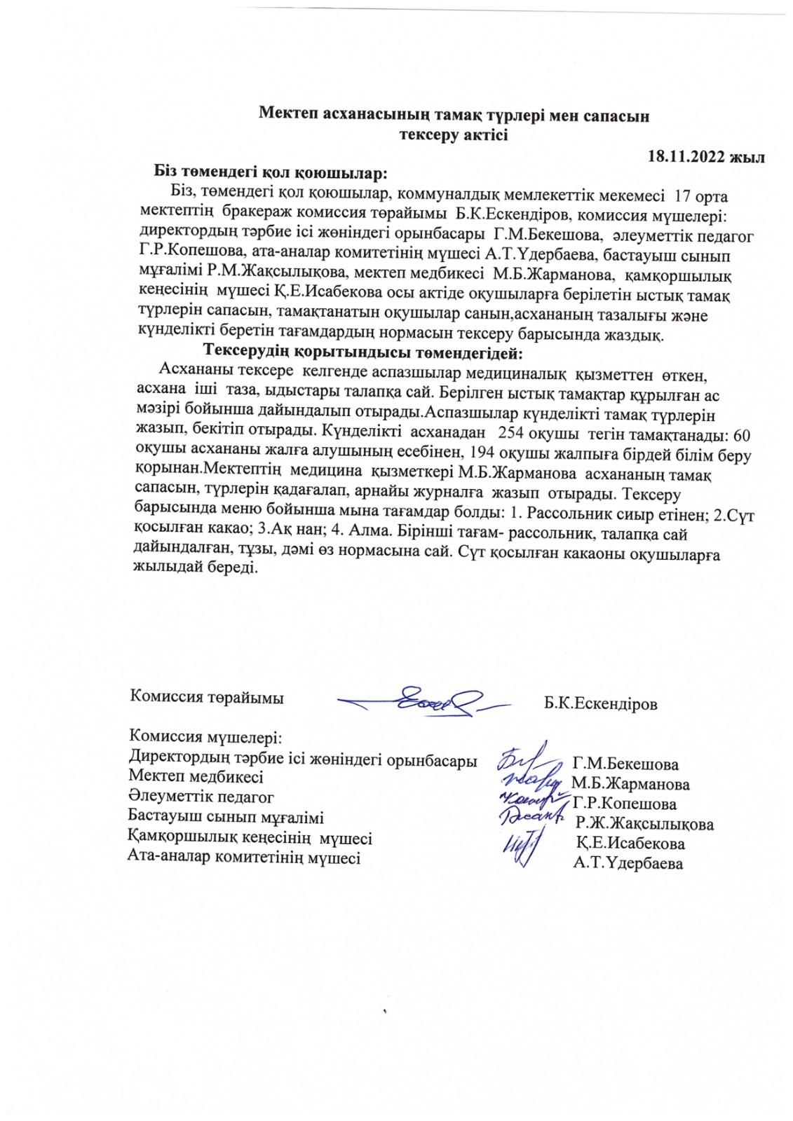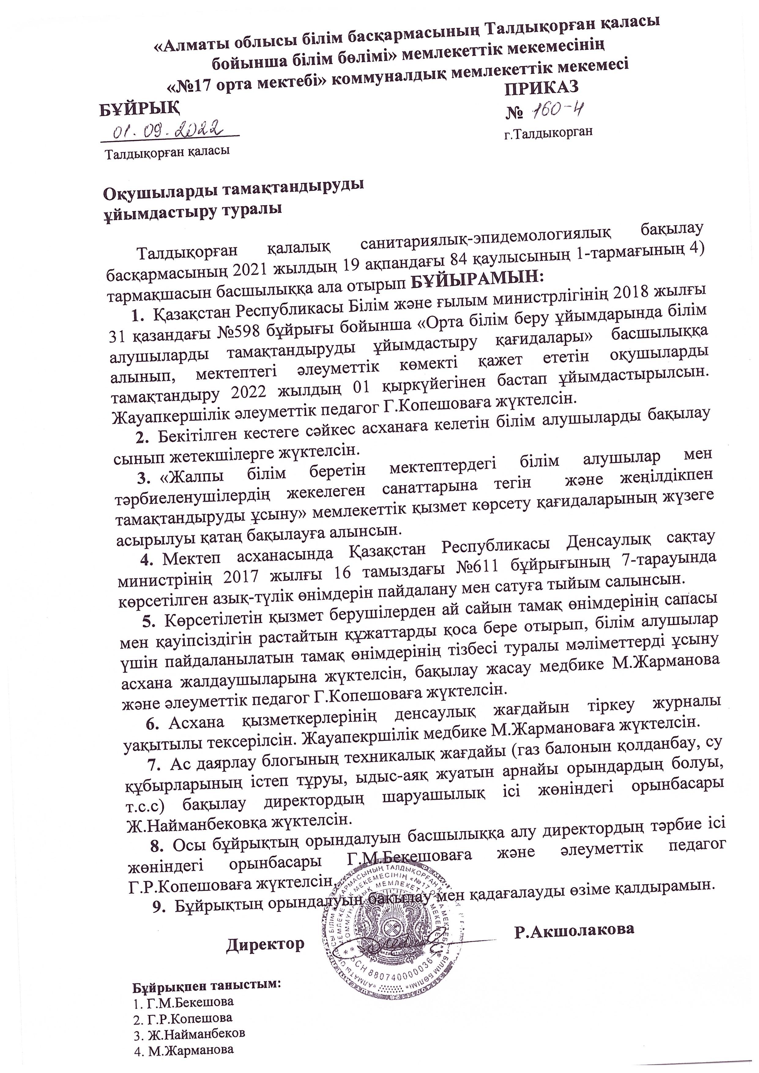 Ыстық тамақты ұйымдастыру » "Жетісу облысы білім басқармасының Талдықорған қаласы бойынша білім бөлімі" мемлекеттік мекемесінің "№17 орта мектебі" Управления образования Кызылординской области "